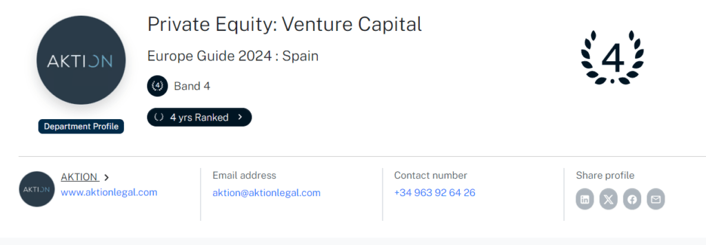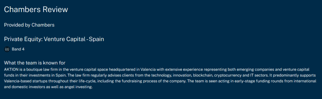 Por cuarto año consecutivo, Aktion Legal ha sido reconocido por Chambers & Partners, consolidando su posición en la categoría de Private Equity: Venture Capital. Destaca como asesor en operaciones y rondas de financiación para startups e inversores, reafirmando su liderazgo en el sector.